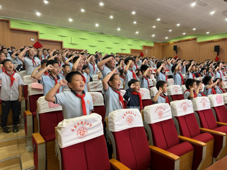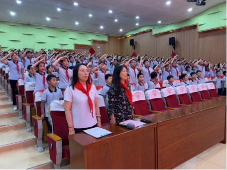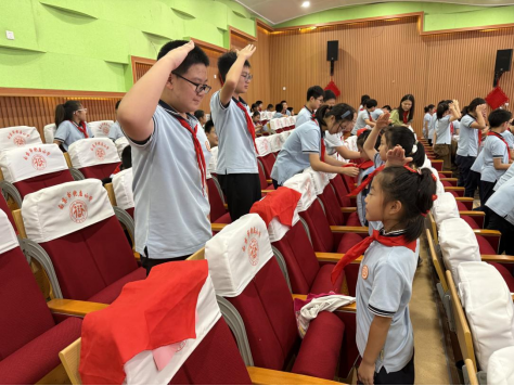“准备着:为共产主义事业而奋斗!”“时刻准备着!”最后,全体队员在蒋老师的带领下,高举右拳,庄严呼号。激昂的呼号声在校园中久久回荡,不仅是对革命先辈的致敬,更是对未来使命的担当。这一刻,红色基因在传承中焕发新生,少先队员的责任感在心中悄然扎根。