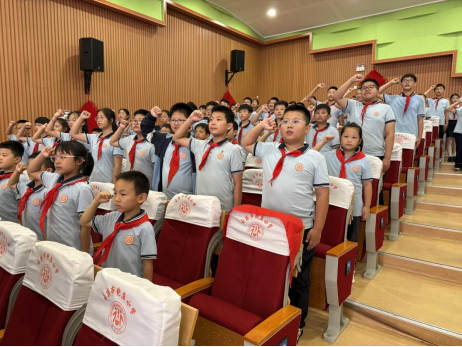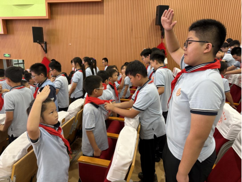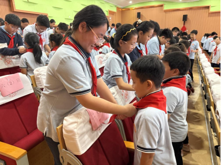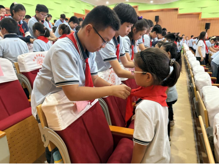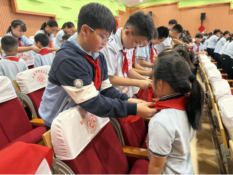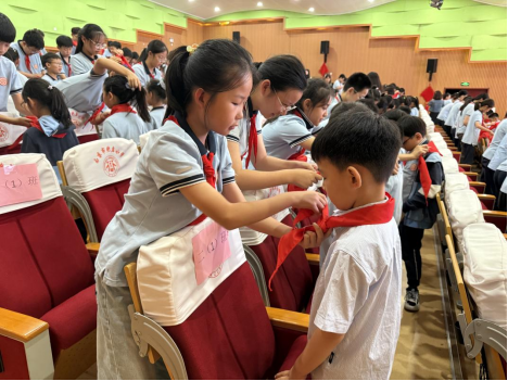 六年级的队员代表们手捧鲜艳的红领巾,面向新队员,他们小心翼翼地将红领巾披在新队员肩上,新队员们抚摸着胸前崭新的红领巾,向老队员敬上第一个标准的队礼,一句“谢谢哥哥姐姐”道出了心中的感动与决心。红领巾在阳光下熠熠生辉,成为连接两代队员的红色纽带。